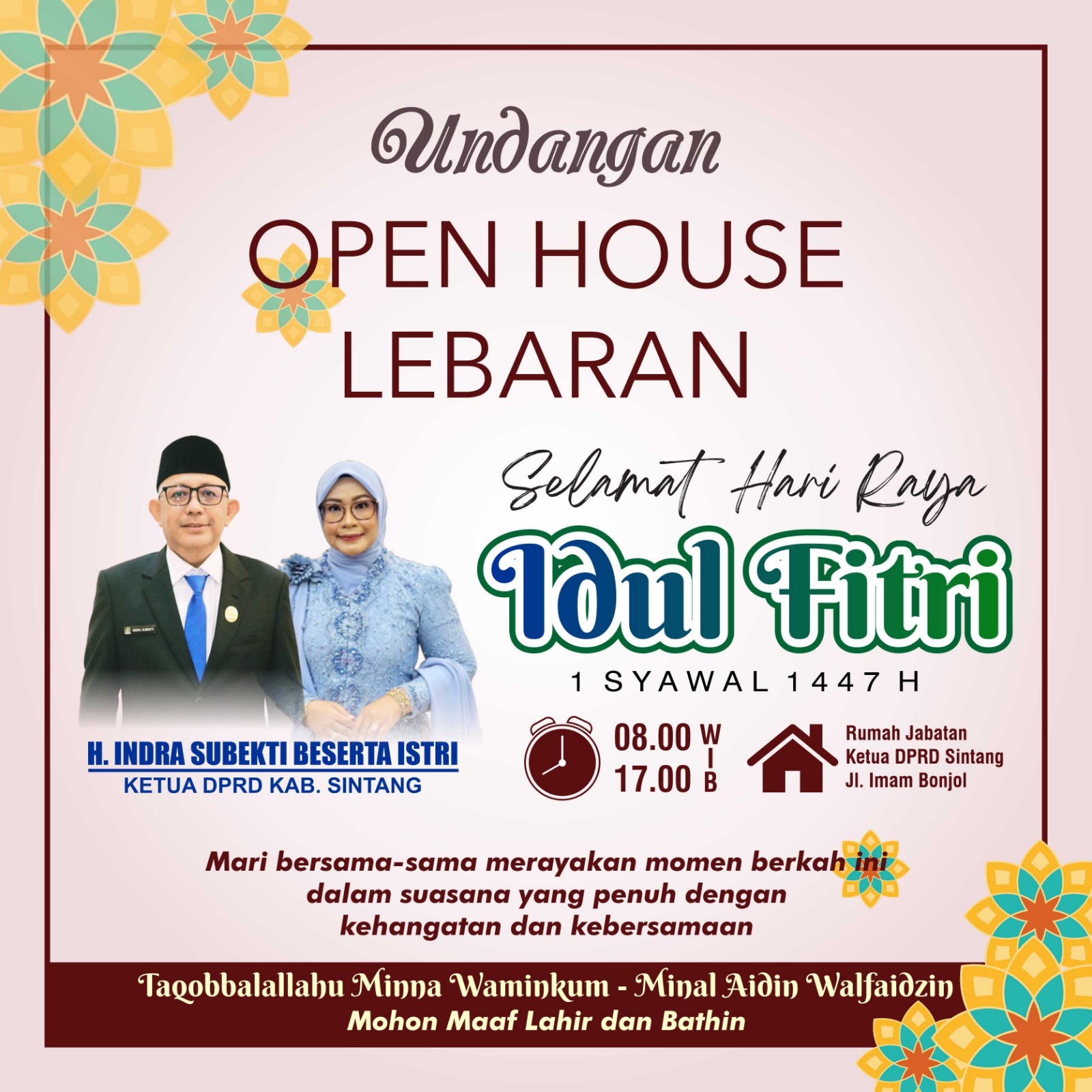 Dalam undangan tersebut, H. Indra Subekti juga mengajak masyarakat untuk bersama-sama merayakan hari kemenangan dengan penuh rasa syukur dan kebahagiaan.