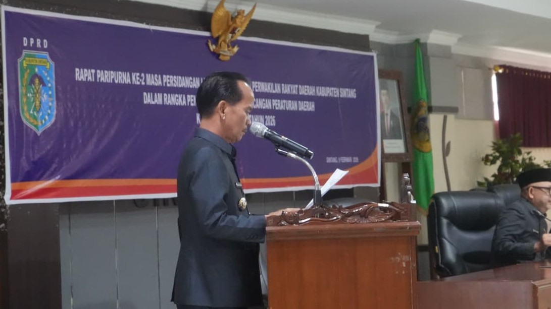 SINTANG, KR – Bupati Sintang, Gregorius Herkulanus Bala, menyampaikan pidato pada Rapat Paripurna ke-2 Masa Persidangan I DPRD Kabupaten Sintang Tahun 2026 dalam rangka penyampaian lima Rancangan Peraturan Daerah (Raperda) Kabupaten Sintang Tahun 2026.