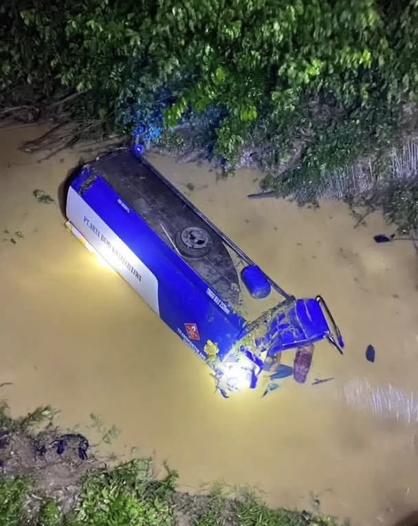 Informasi yang dihimpun menyebutkan, truk tangki tersebut nyungsep ke sungai setelah diduga kehilangan kendali saat melintas di jembatan. Dalam sejumlah video yang beredar di masyarakat, terlihat kondisi pembatas jalan di lokasi kejadian mengalami kerusakan parah.